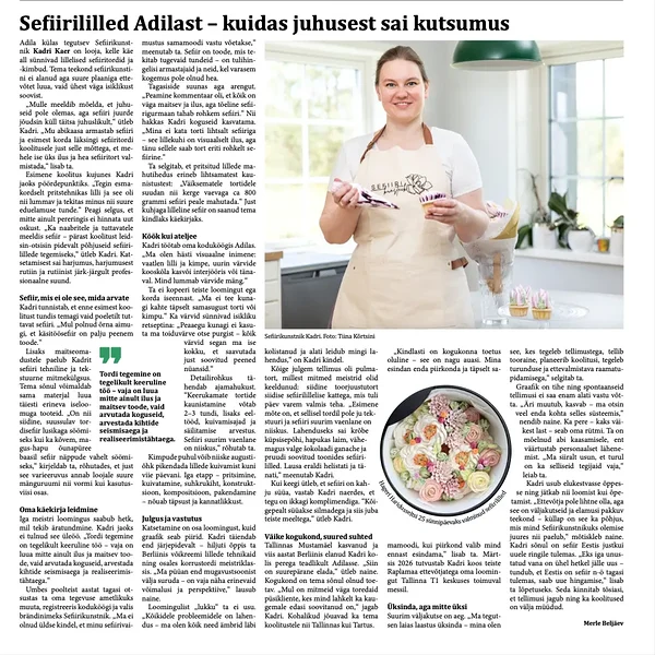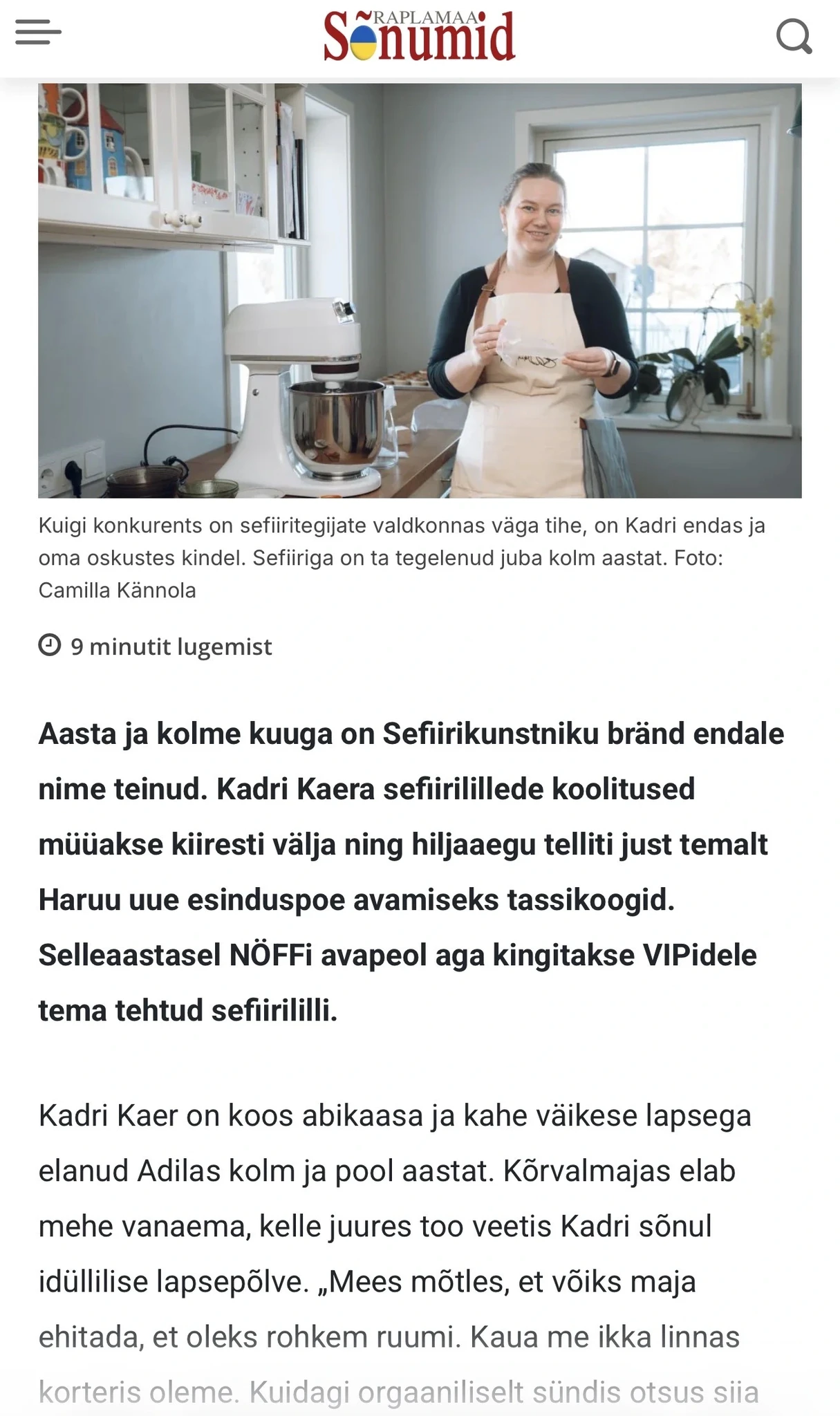 Minu lemmikud on lillelised sefiiritordid, õunasefiirist kimbud ja -karbid, tassikoogid ning kaunistatud makroonid. Tegutsen oma armsas koduköögis Kohila vallas, Adilas.