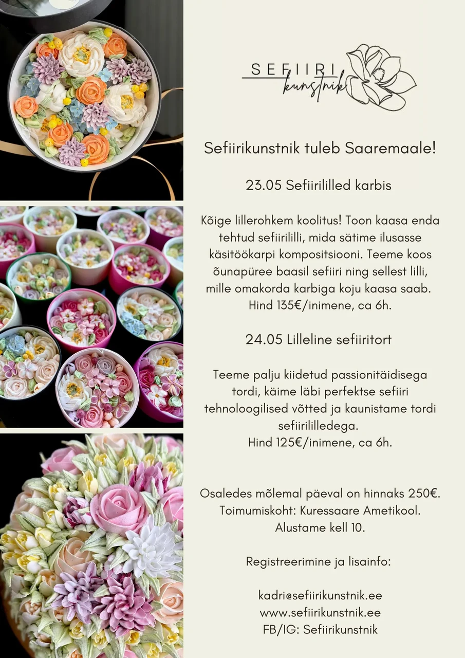 Koolitused koguvad üha suuremat populaarsust, juba tuleb kutseid erinevatesse kodumaa nurkadesse ja kaugemalegi (sai ju juba isegi Berliinis koolitamas käidud!). Minu vanaema oli saarlane ja lapsepõlves kõige oodatum perepuhkuse aeg oligi just reis Saaremaale. Mul on siiralt hea meel, et mais tulen ma Kuressaare Ametikooli ja kahel päeval on meil võimalik koos sefiirikunsti teha! Tule kindlasti - jagan palju praktilisi nippe ja trikke, käime läbi kõik tehnilised nüansid, et kodus edasi harjutades kõik suurepäraselt õnnestuks. Koolitused on täiesti erinevate sefiiridega, seega suurema huvi korral saab loomulikult mõlemal päeval osaleda ja palju uut õppida ja avastada. Hea võimalus lähedasi oma uute oskustega üllatada. Koolitus sobib nii algajale kui ka (hobi)kondiitrile osksuste täiendamiseks.