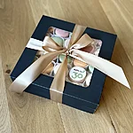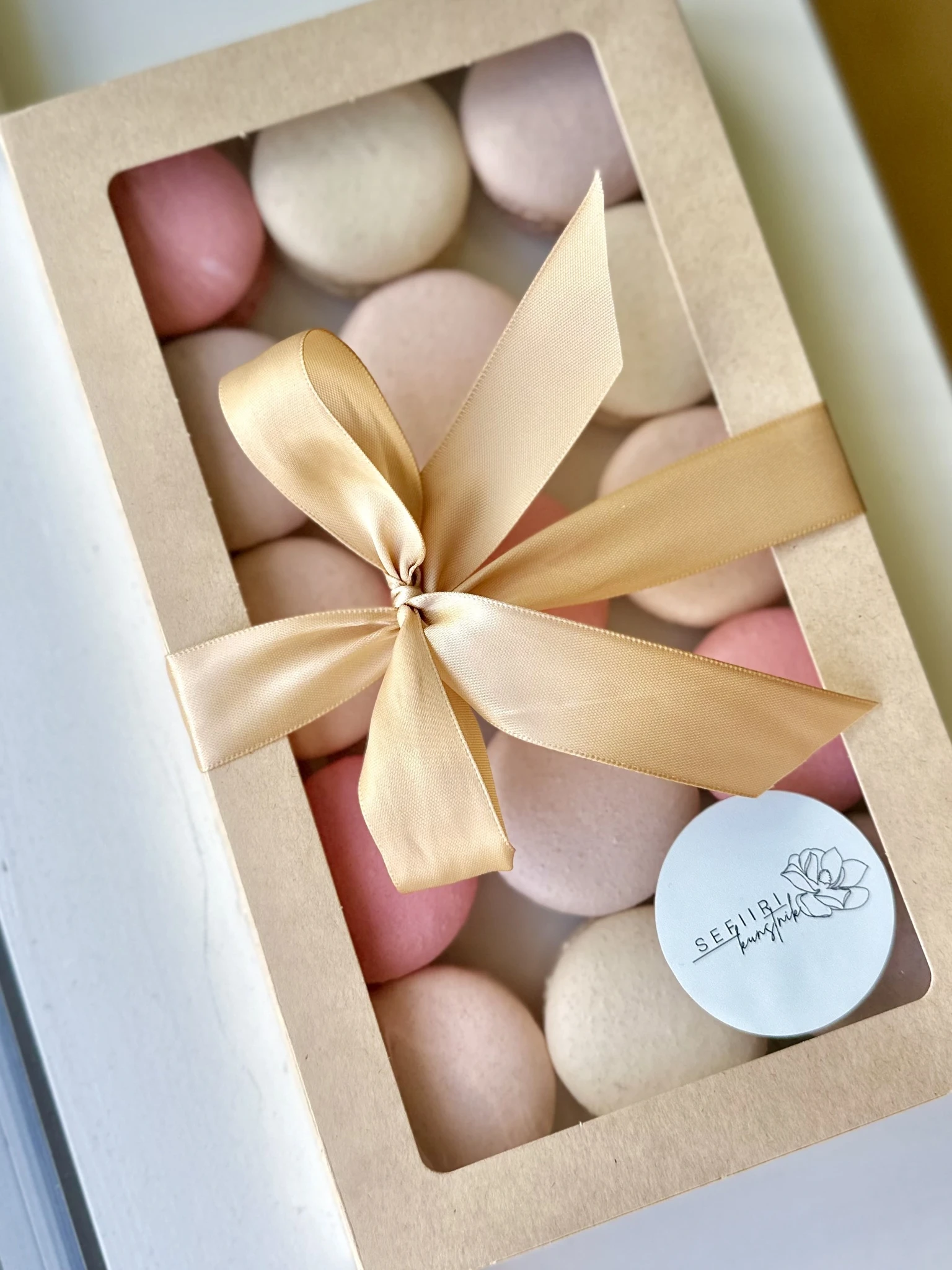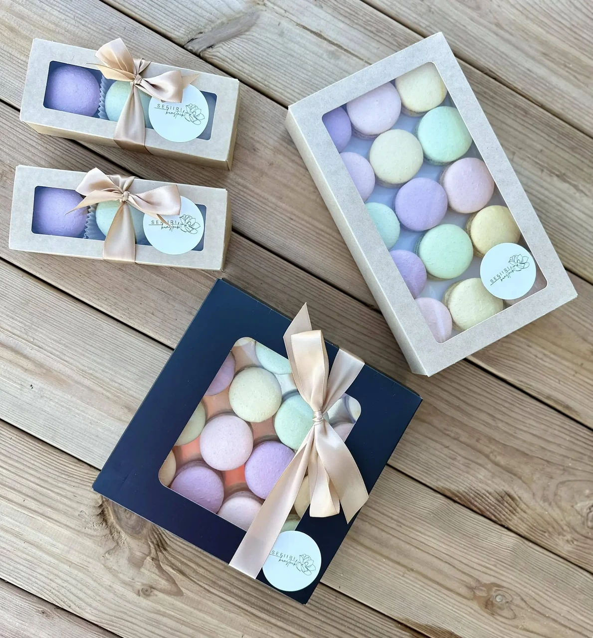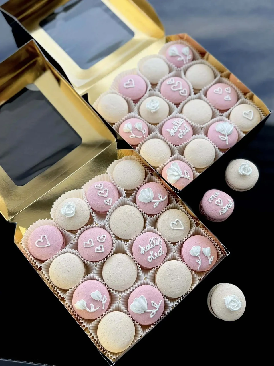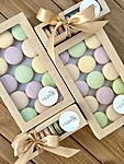 Makroone saab tellida ka uhkes (25tk mahutavas) kinkekarbis, milles osa makroone on kaunistatud ning võimalik on lisada ka enda personaalne sõnum. Sellises karbis on üldjuhul 5 erinevat värvi ja maitset. Minu kinkekarbid on mati pealispinnaga musta värvi, seest aga läikivalt kuldsed. Valmis karbile lisan enda logoga kleepsu ning ilusa kuldse paela.